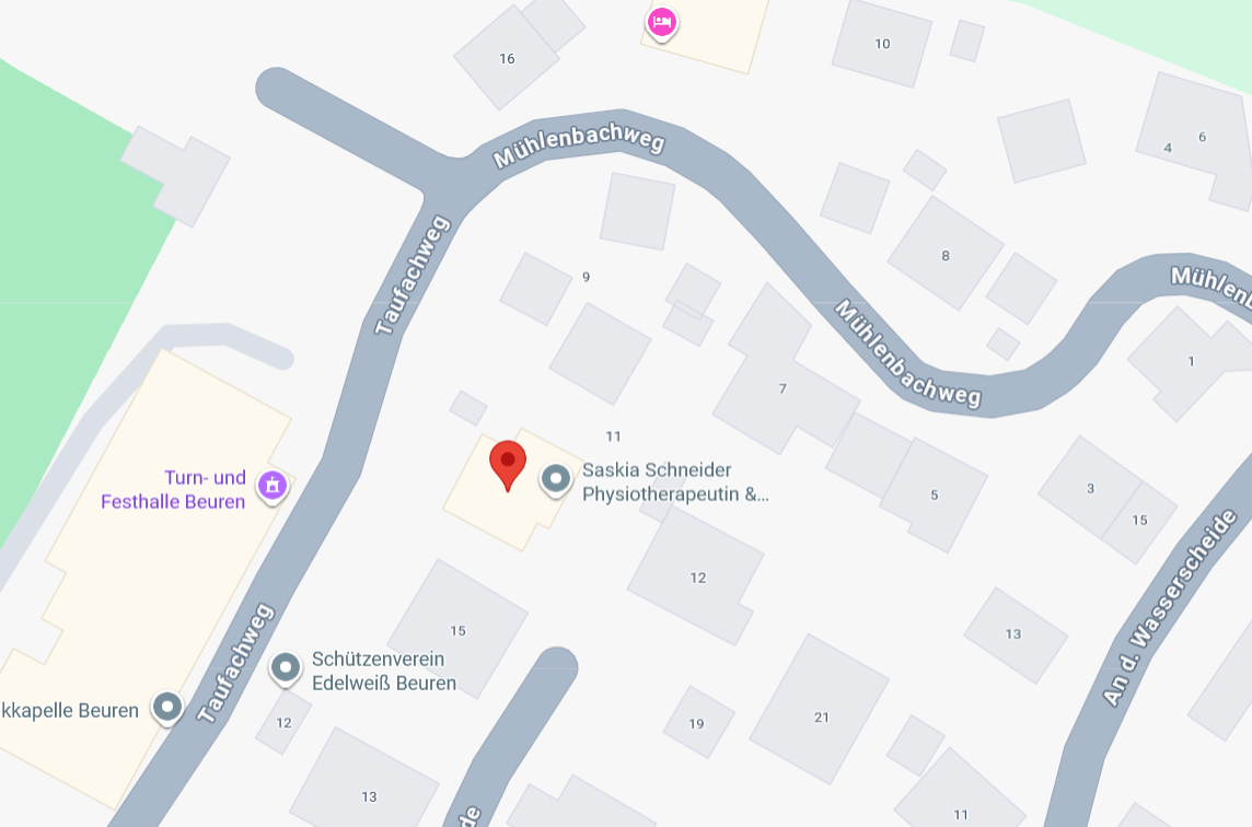 Meine Praxis befindet sich in der Braunhalde 17/1 in 88316 Isny- Beuren. Bitte beachten Sie, dass der direkte Zugang zur Praxis von dieser Adresse aus nicht möglich ist. Die Zufahrt zum Praxiseingang erfolgt ausschließlich über den Taufachweg 12 (Sportplatz und Turnhalle). Dort befinden sich ausreichend öffentliche Parkplätze. Der Eingang zur Praxis ist gut sichtbar beschildert und leicht auf Höhe des Basketballfeldes zu finden.